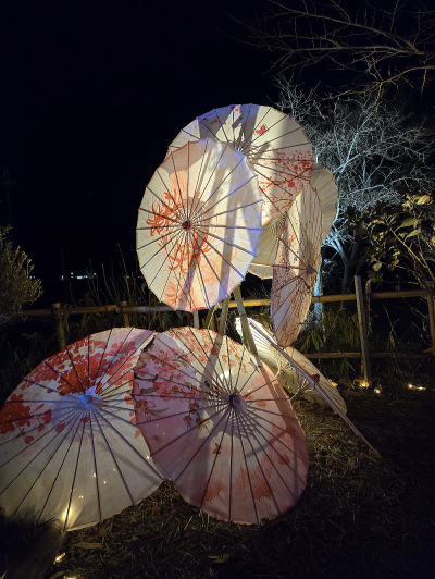 | 金魚提灯のヒレの先に、和傘と桜のオブジェ |