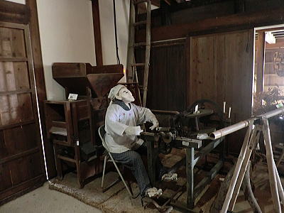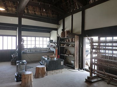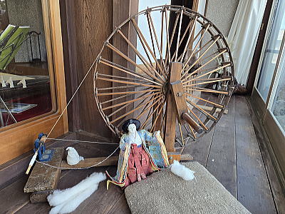 玄関入ると織機とお雛さまがお出迎え |