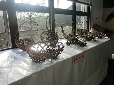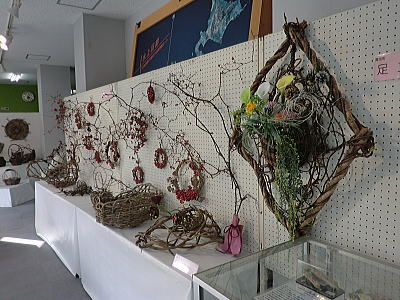 館内はクズやフジ、ブドウ等で編んだ籠やリース、
