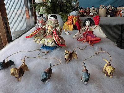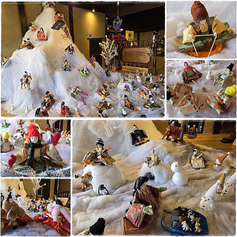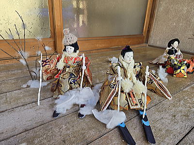 | 雪山を上るリフトのほかスノーボードやそり滑りを楽しむ雛人形が勢ぞろい |