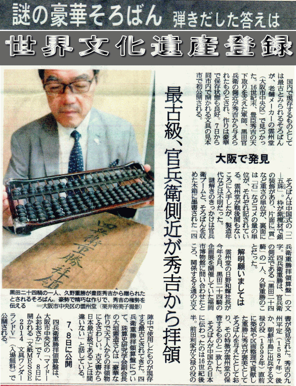 私が提案する算盤オリンピック(珠算オリンピック)計算が合わない(採算が合わない)の言葉を世界共通語に。尚算盤を世界遺産に登録を、そろばん新聞で呼びかけていましたが、中国に先を越された感じで、いる所ですが言い換えれば日本の算盤も無形文化遺産の登録も可能で有るという事である。地元の発展と読み・書き、算盤の復活・願い、個々の算盤塾や全珠連共、連携して遺産登録を獲得して算盤を基に世界にリスクのない、そろばん経済創設である。又の名を養食経済