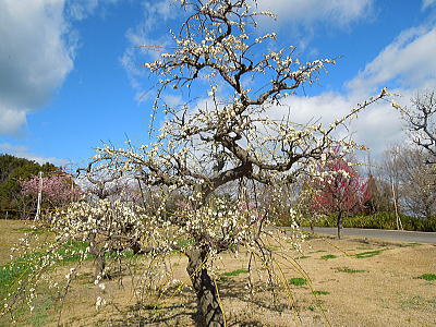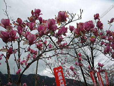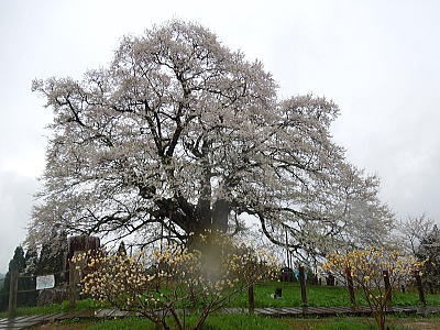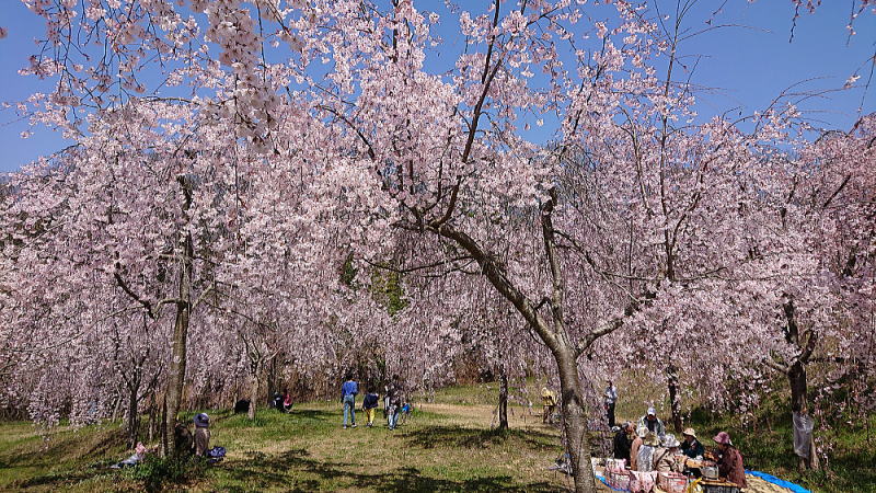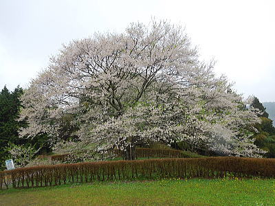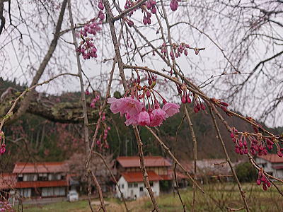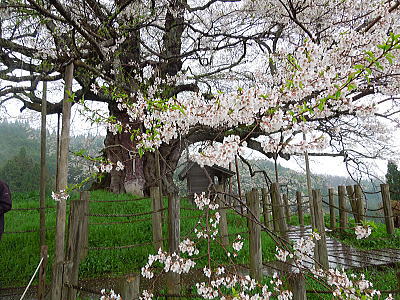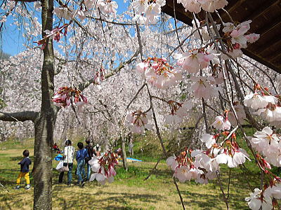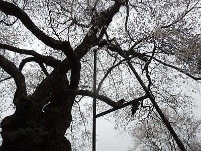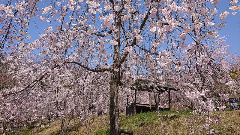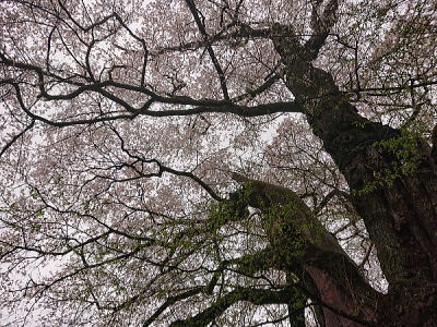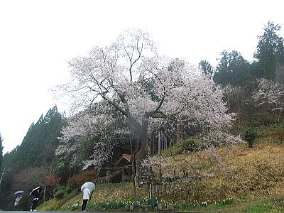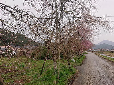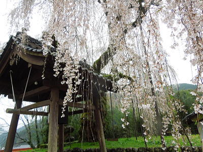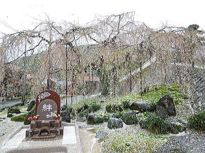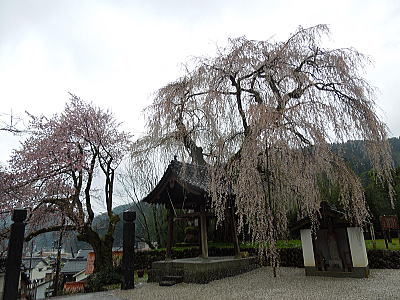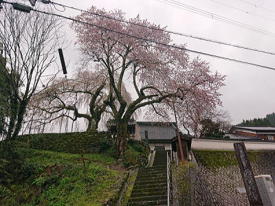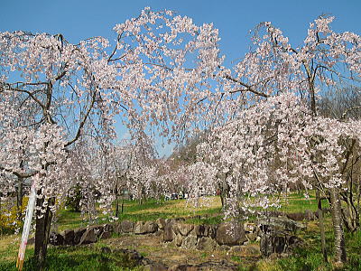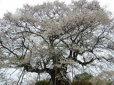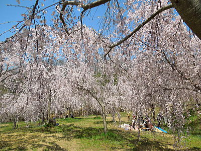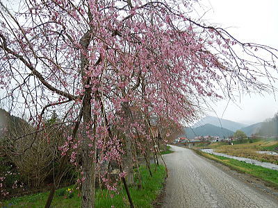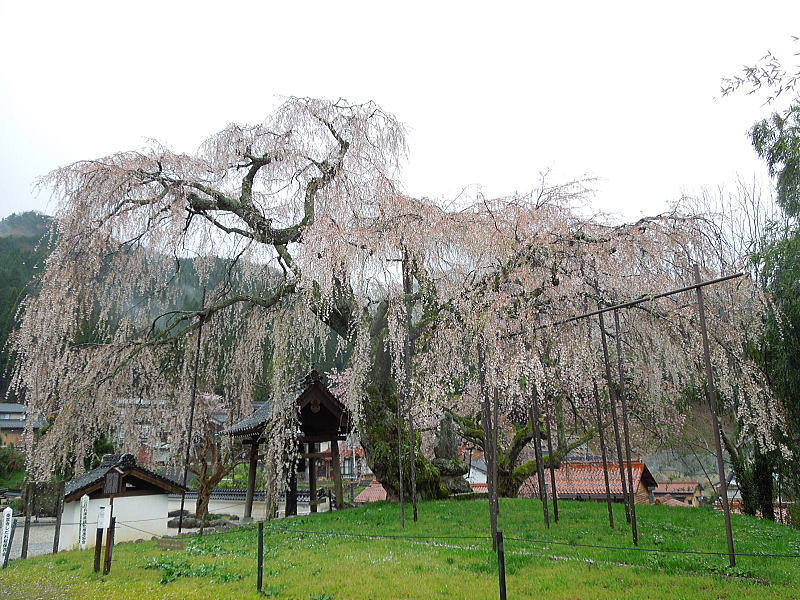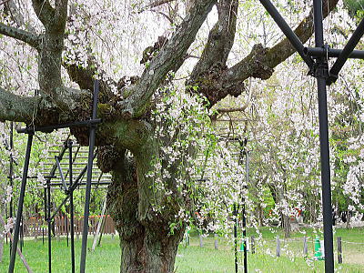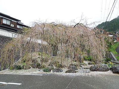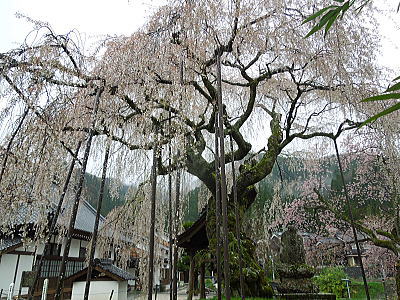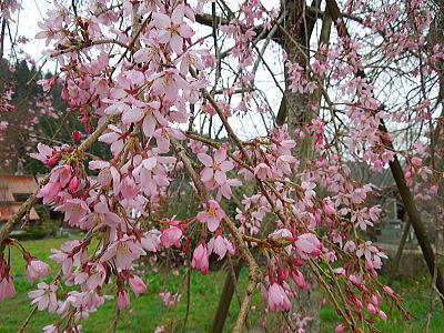 | 八重紅枝垂れ桜の【斎王桜】。その名に恥じない美しい枝垂れ桜です。幹周 2.57m、樹高 10m |