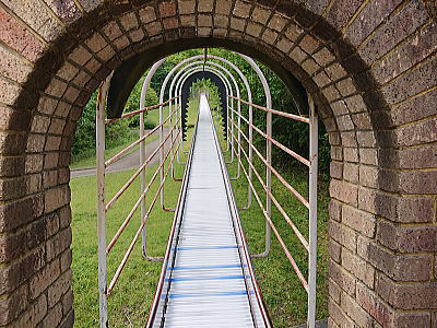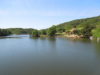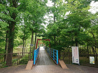 橋が架かり、対岸には樹木が茂っています。 |