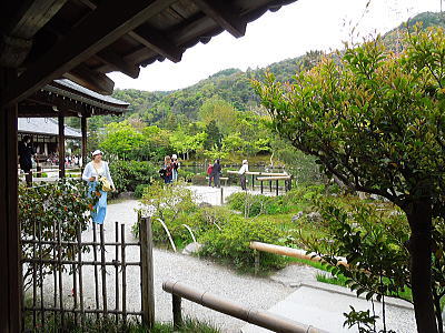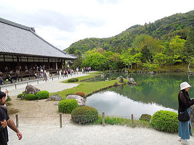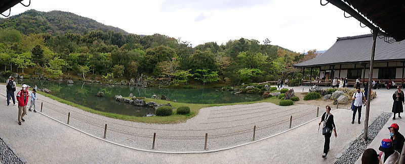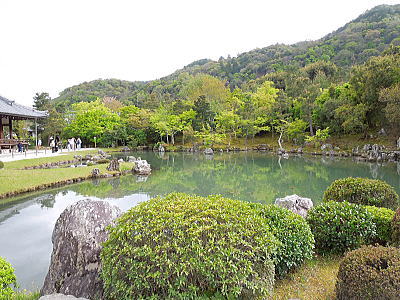 大方丈の裏側になる西は曹源池に面し大堰川を隔てた嵐山や庭園西に位置する亀山を取り込んだ借景式庭園でもある池泉回遊式庭園。
