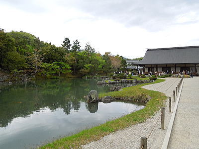 お堂に上がって見る庭園こそ、天龍寺の醍醐味。曹源池の周囲にある白い石、水面に映る木々、