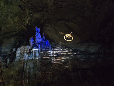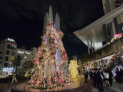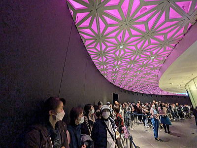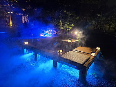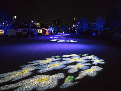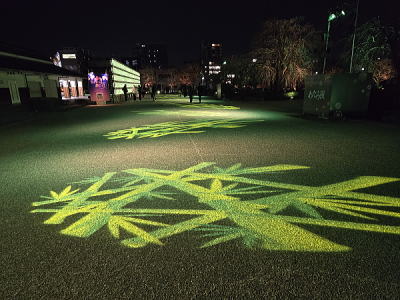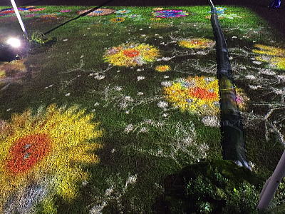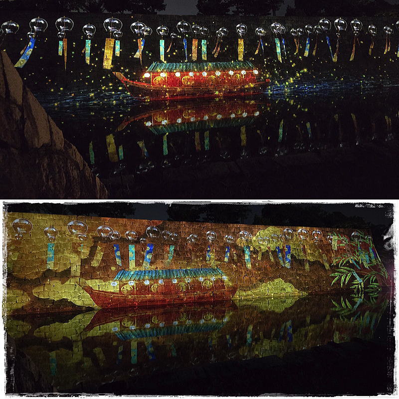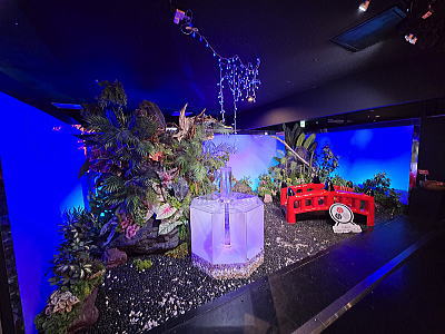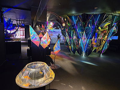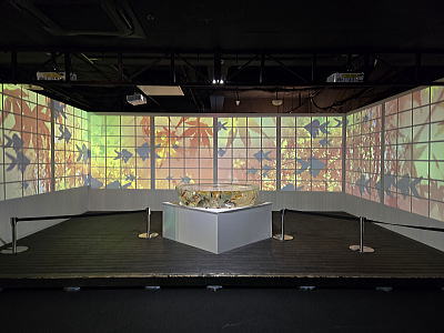 | 横幅12mの壁面に水中、森林、色鮮やかなファンタージプロジェクトマッピングを背景に泳ぐ金魚たち |