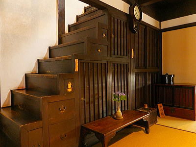 中の間から二階への階段は、狭い空間を有効に使おうと