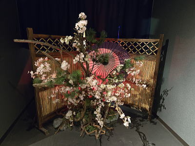 | 金魚提灯のヒレの先に、和傘と桜のオブジェ |