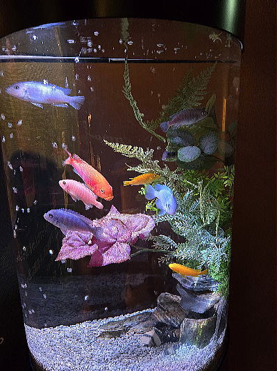 通路の壁にはめ込まれた円柱のアクアリュウム |