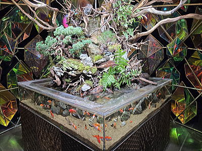 その中で泳ぐ金魚たちは優雅で、アートの一部になっています。 |