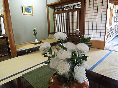 奥の間の床に飾られた菊、ここにも綿が被せてあります