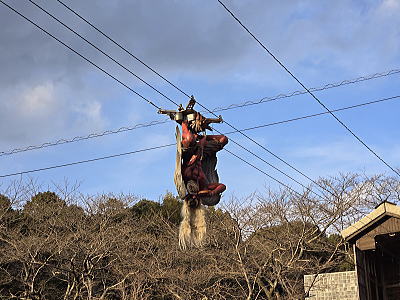 「 妖怪小屋」 地上3mの位置に作られた小屋から妖怪(天狗)がどら焼きを持って飛び出してきます